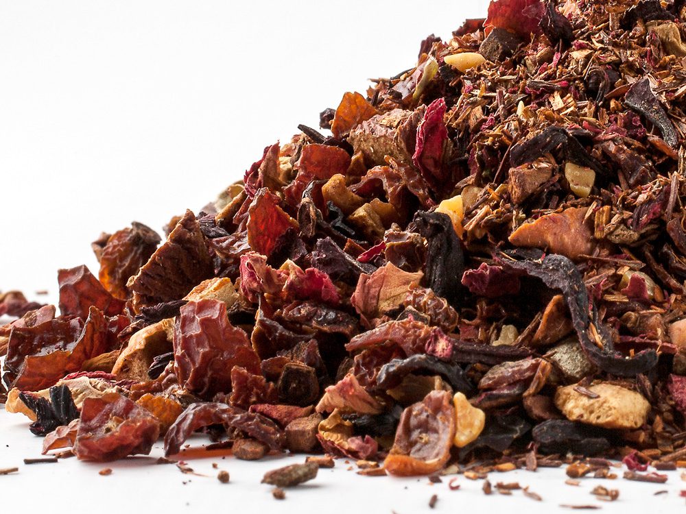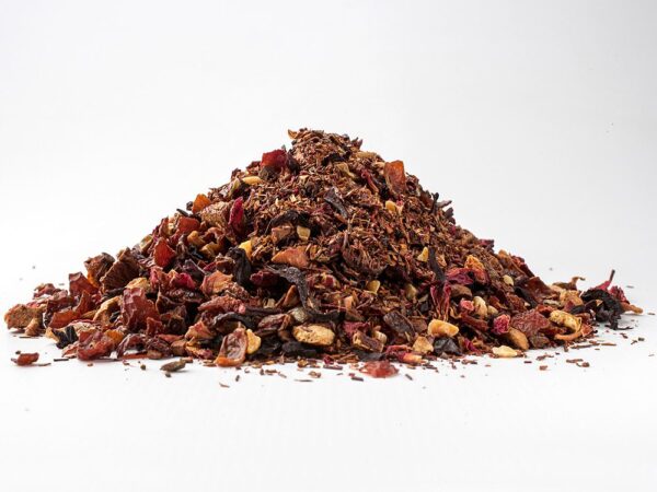 Opis: Owoc róży, hibiskus, jabłko, rooibos, skórka pomarańczowa, cynamon, migdały, płatki róży, aromat, wanilia. Bez kofeiny. Deklaracja wartości odżywczych na 100 ml: