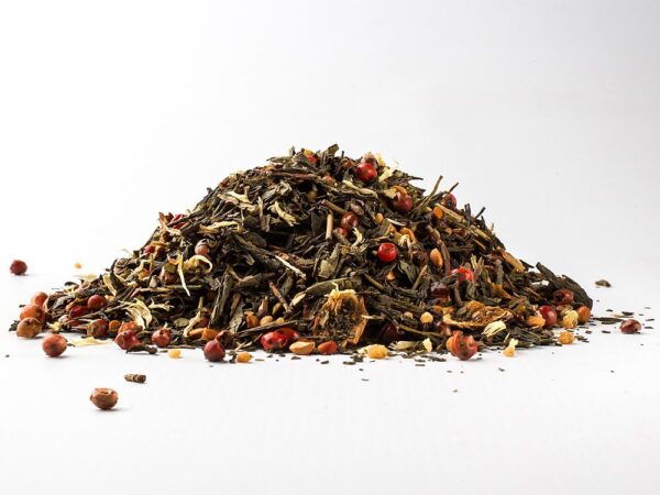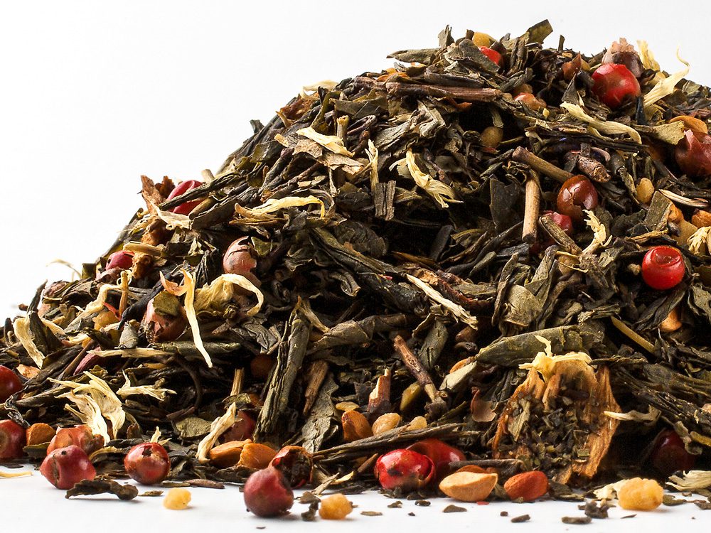 Opis: Zielona herbata, cynamon, chipsy jabłkowe (5%), cynamon, skórka pomarańczowa, prażony ryż, płatki róży, migdały, goździki, aromat. Wartość odżywcza na 100 ml: Energia 5 kJ />0,1 kcal. Tłuszcz <0,1 g, w tym nasycone <0,1 g. Węglowodany <0,2 g, w tym cukry <0,1 g. Białko <0,1 g. Sól <0,1 g.