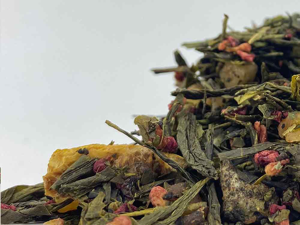 Opis: Zielona herbata Sencha, brzoskwinia (12,1%) (brzoskwinia, mąka ryżowa), mango (mango, cukier, regulator kwasowości: kwas cytrynowy), czerwone maliny, cytryna (6%), naturalny aromat. Deklaracja wartości odżywczych na 100 ml:
