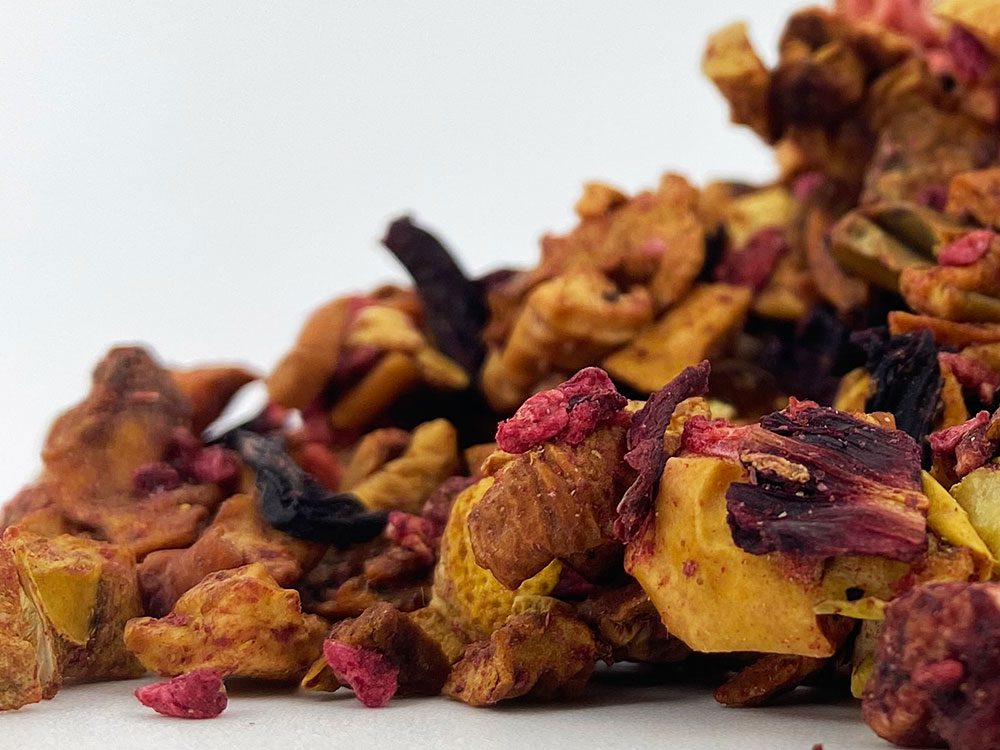Opis: Jabłko, hibiskus, skórka pomarańczowa, malina czerwona, truskawka, porzeczka czerwona, wanilia. Bez kofeiny. Deklaracja wartości odżywczych na 100 ml: