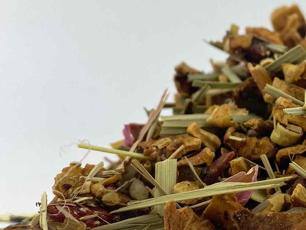 Opis: Jabłko, ananas (ananas, cukier, regulator kwasowości: kwas cytrynowy), mango (9,4%) (mango, cukier, regulator kwasowości: kwas cytrynowy), jagody goji, trawa cytrynowa (6,1%), róża, liście mięty, aromat. Wartość odżywcza na 100 ml: