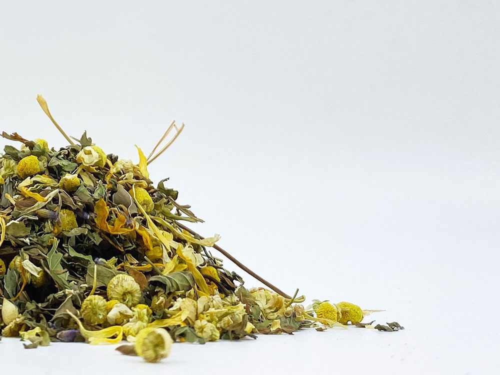Opis Liście mięty, rumianek, liście jeżyny, wiciokrzew, liście truskawki, płatki róży, kwiaty pomarańczy. Wartość odżywcza na 100 ml: