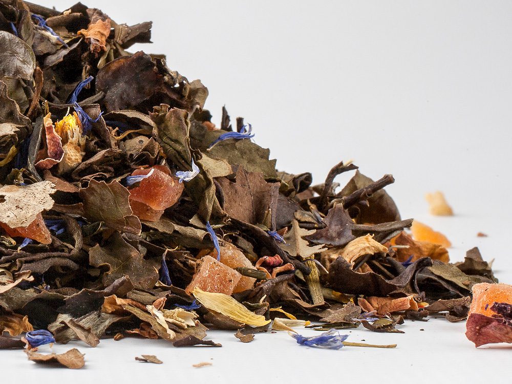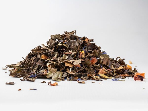 Opis: Biała i zielona herbata z Chin, papaja (papaja, cukier surowy, zakwaszacz: kwas cytrynowy), aromat, mango (mango, cukier surowy, zakwaszacz: kwas cytrynowy), róża, goździk, pieprz, gruszka, chabry 1,5%, nagietek 1,5%. Wartość odżywcza na 100 ml:
