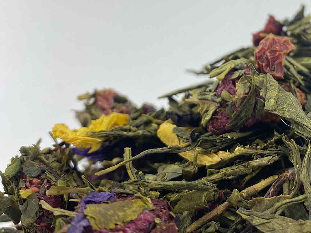 Opis: Zielona herbata Sencha, róża, mięta (5,1%), aromat, czerwone maliny (3,3%), słonecznik, ślaz. Deklaracja wartości odżywczych na 100 ml: