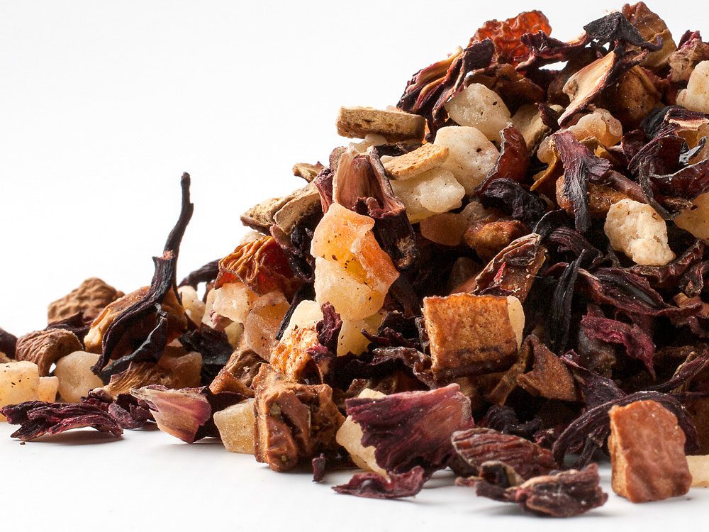 Opis: Kawałki jabłka, hibiskus, owoc dzikiej róży, skórka pomarańczy, aromat. Bez kofeiny. Deklaracja wartości odżywczych na 100 ml:
